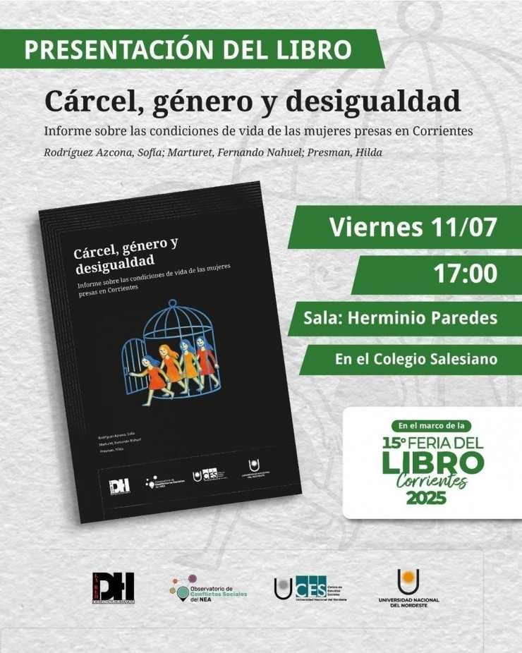 Este viernes 11 de julio a las 17 horas, en la Sala Herminio Paredes del Colegio Salesiano, se presentará el libro Cárcel, Género y Desigualdad en el marco de la XV Feria Provincial del Libro de Corrientes. El informe es el resultado de una investigación colectiva realizada entre 2022 y 2024 por el Observatorio de Conflictos Sociales del NEA y la Red de Derechos Humanos Corrientes, en articulación con el Comité Nacional para la Prevención de la Tortura (CNPT).