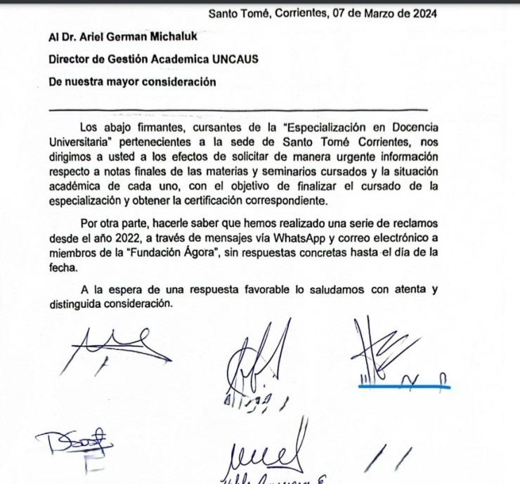 Por ello, presentaron varios reclamos vía whatsapp, correos electrónicos y notas firmadas por varios perjudicados. Pero a febrero del 2025, no obtienen respuestas "ni de la fundación ni de la universidad", se quejaron.